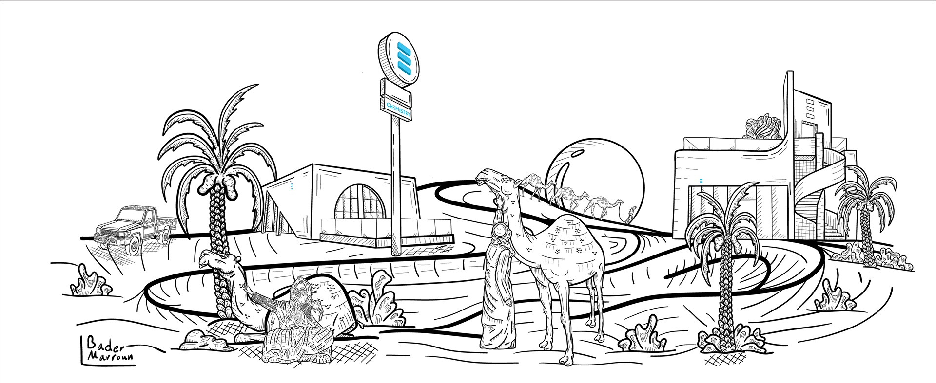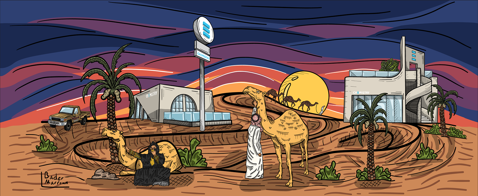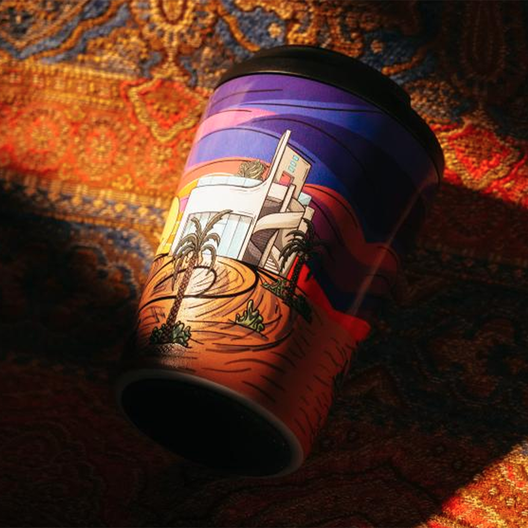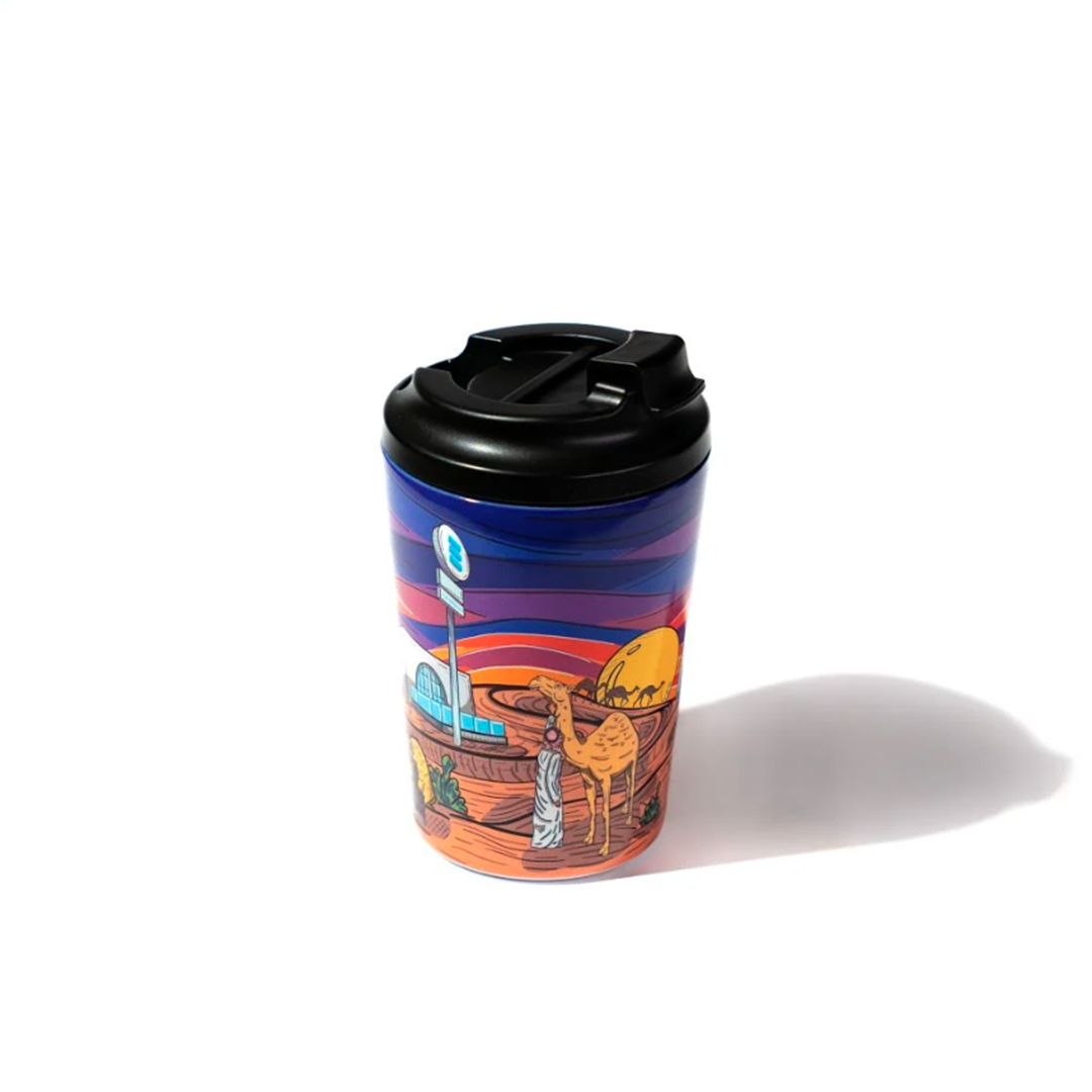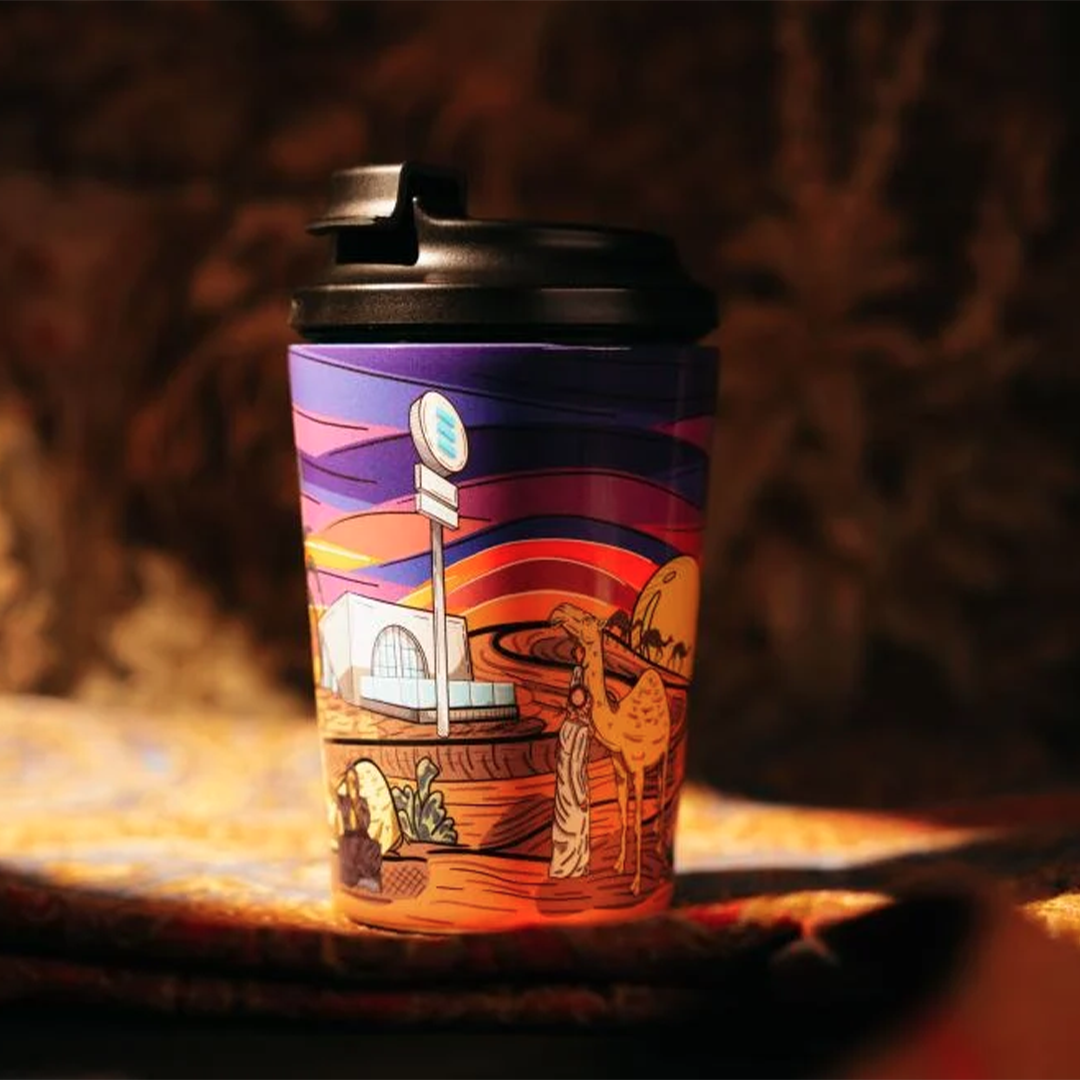 The artist Bader Marroun developed The "Chemistry Desert" cup is designed in collaboration with Chemistry coffee to reflect the depth of Saudi heritage, blending traditional and modern elements. The design features a background rippling with blue and purple, topped by a purple sunset sky, while a camel appears alongside its owner, together symbolizing patience and tradition. Nearby, a woman shaded by a palm tree adds a rich cultural dimension to the scene. Close to them, the modern structure of the "Chemistry" café stands as a testament to the fusion of age-old traditions with modernity. This contrast enhances the connection between past and present, creating an artistic piece that embodies beauty, elegance, and heritage in a captivating visual narrative that expresses the spirit of the place.