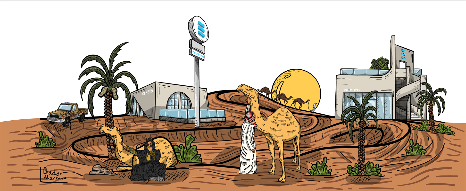 قام الفنان بدر مرون بتصميم كوب "صحراء كيمستري" بالتعاون مع مقهى كيمستري ليعكس عمق التراث السعودي، ممزوجًا بين العناصر التقليدية والحديثة. يُظهر التصميم خلفية متوموجة بالأزرق والأرجواني تعلوها سماء الغروب الأرجوانية، بينما يظهر جمل برفقة صاحبه، يرمزان معًا للصبر والتقليد. إلى جانبهما، تُشاهد امرأة مستظلة بالنخلة، مضفية بعدًا ثقافيًا غنيًا على المشهد. بالقرب منهم، يبرز مبنى مقهى "كيمستري" الحديث كدلالة على اندماج العراقة بالمعاصرة. هذا التباين يُعزز الرابط بين الماضي والحاضر، مخلقًا قطعة فنية تجسد الجمال، الأناقة والتراث في لوحة فنية ساحرة تُعبر عن روح المكان.
