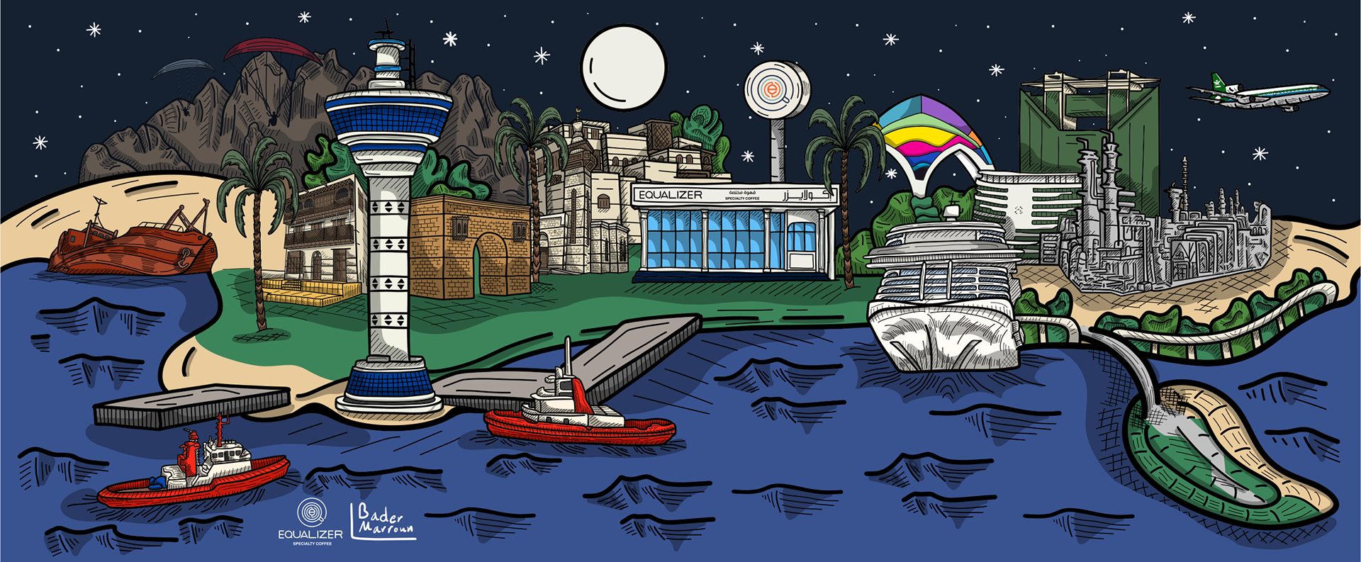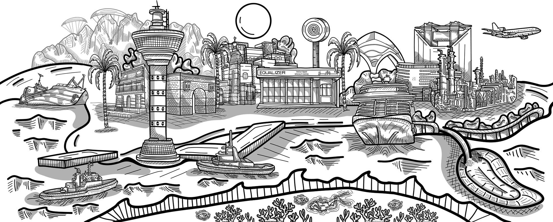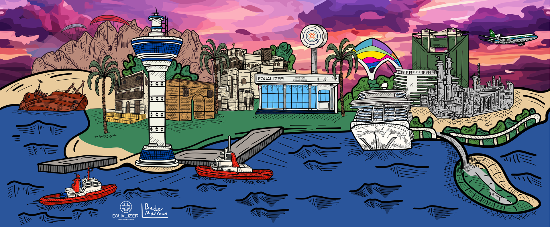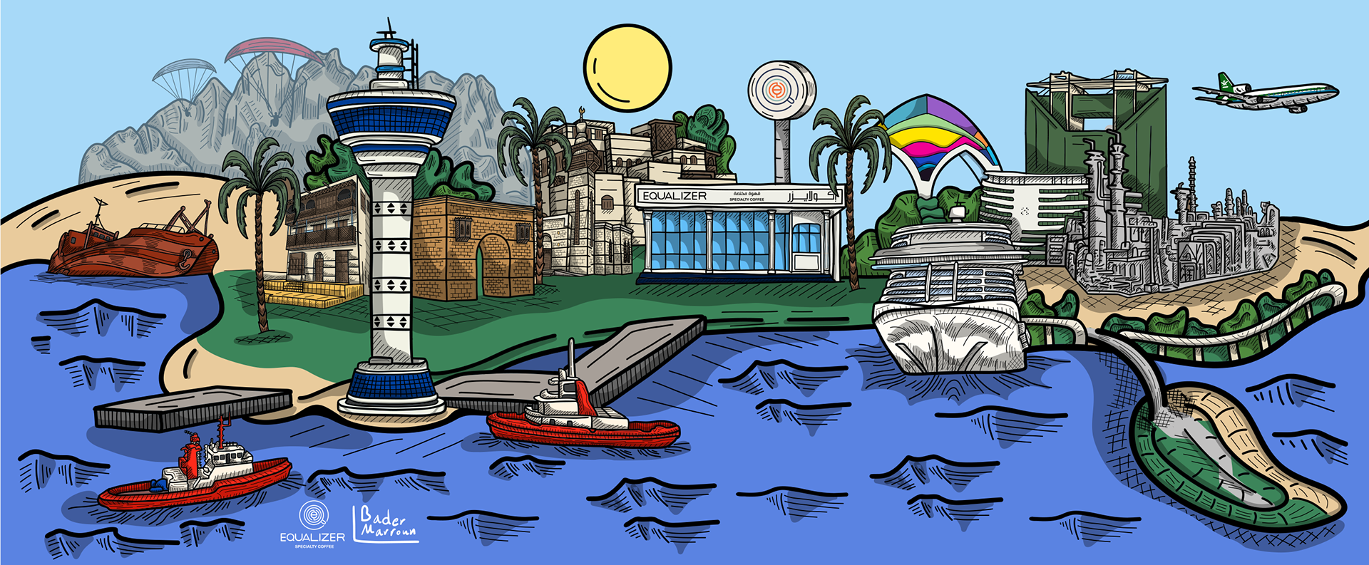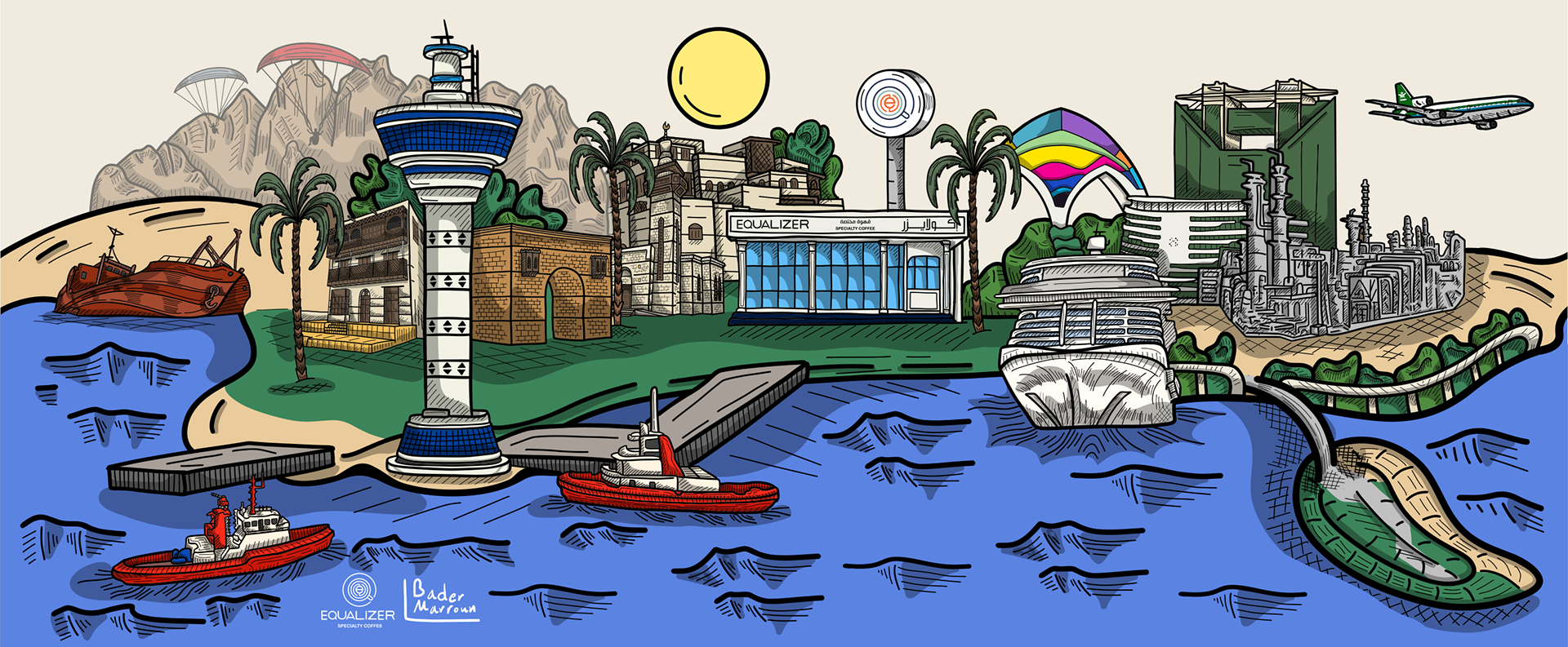 This artwork captures the cultural and industrial dimensions of the city of Yanbu, weaving together a harmonious scene that reflects the balance between nature and the pulse of industrial development. The details move fluidly across the city's diverse landmarks—from modern industrial zones to ancient historical sites and vibrant entertainment venues—highlighting the essence of Yanbu. The piece also celebrates the spirit of paragliding, which paints the sky with motion and adds a breath of adventure and freedom. It tells the story of a city where heritage and modernity intersect in perfect harmony. This is Yanbu—where tradition melts into progress, and the colors of the sea embrace the horizon of industry in a scene that captivates the eye.