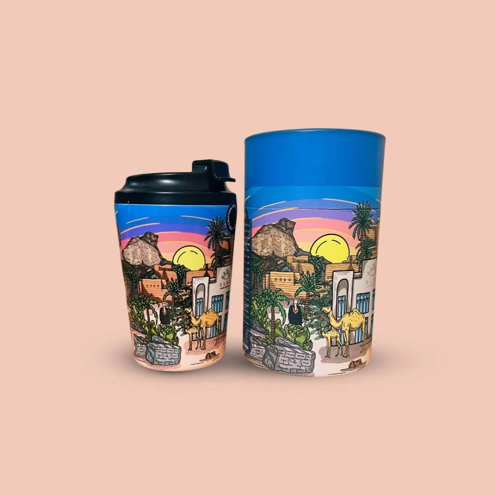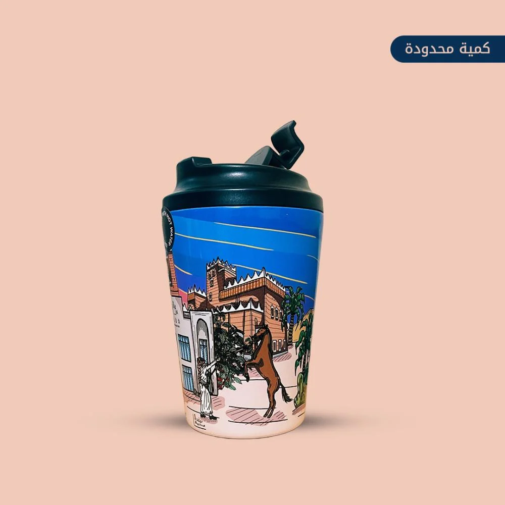 لوحة نجران: فنٌ يروي التاريخ والطبيعة تجسد هذه اللوحة التي تم تطويرها لمقهى ومحمصة ألبا في كوب نجران معالم منطقة نجران في إطار فني يعكس عبق التاريخ وعمق الحضارة. تتنقل تفاصيلها بين منطقة أصحاب الأخدود التاريخية والنقوش التي توثق لحظات من حياة الماضي، إلى منطقة حمى المدرجة في قائمة اليونسكو للتراث العالمي، حيث تعكس نقوشها الحياة في عصور غابرة. ولا تغفل اللوحة المباني الطينية ونخيل منطقة نجران التي تعد رمزاً للأصالة والعراقة. تحتفي اللوحة كذلك بالزي الثقافي، متجسداً في ظهور الجنبية ضمن الأزياء التقليدية والرقصات الفلكلورية. كما تسلط الضوء على أصالة الخيل والإبل والارتباط بهما كمكونات رئيسية من الهوية النجرانية. وفي الخلفية، تمتد صحراء الربع الخالي وآفاقها الواسعة والمناطق الصخرية، مما يضيف عمقاً وملمساً مميزاً لهذه القصة البصرية الملهمة