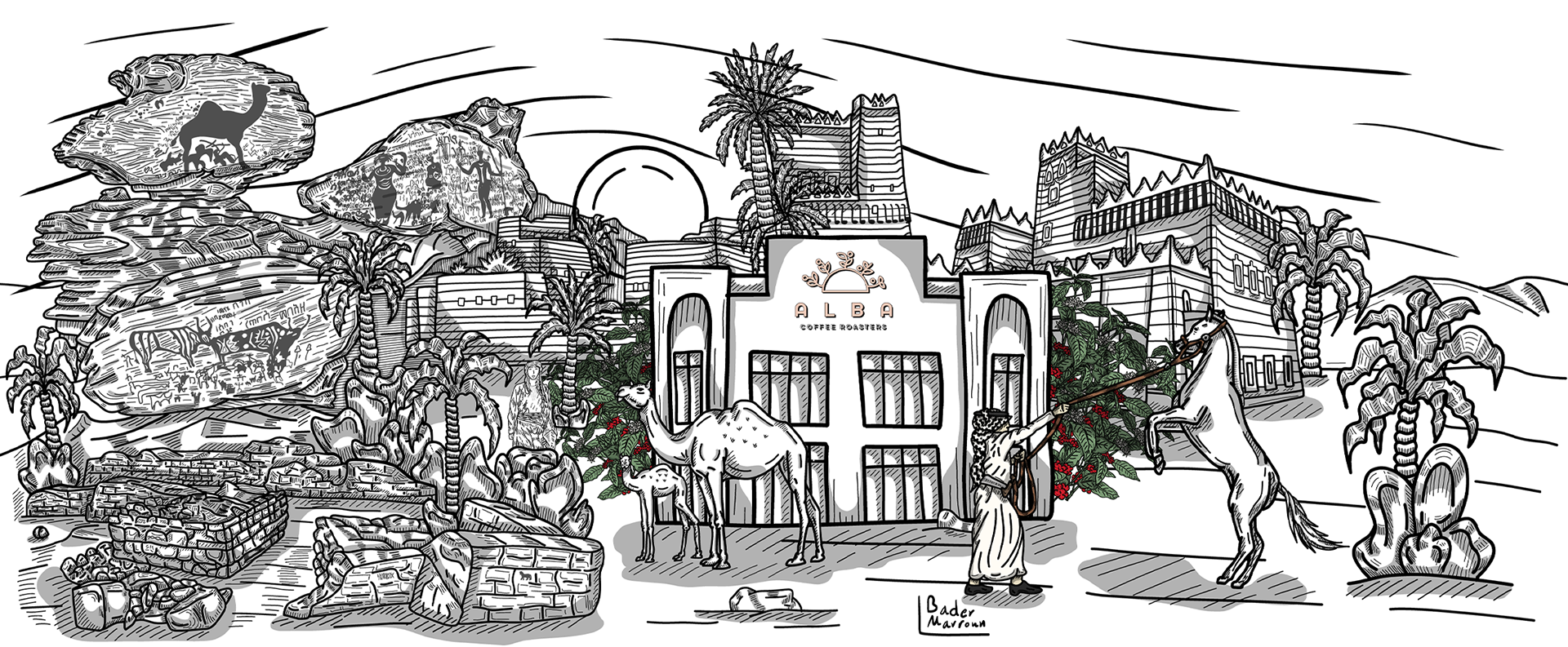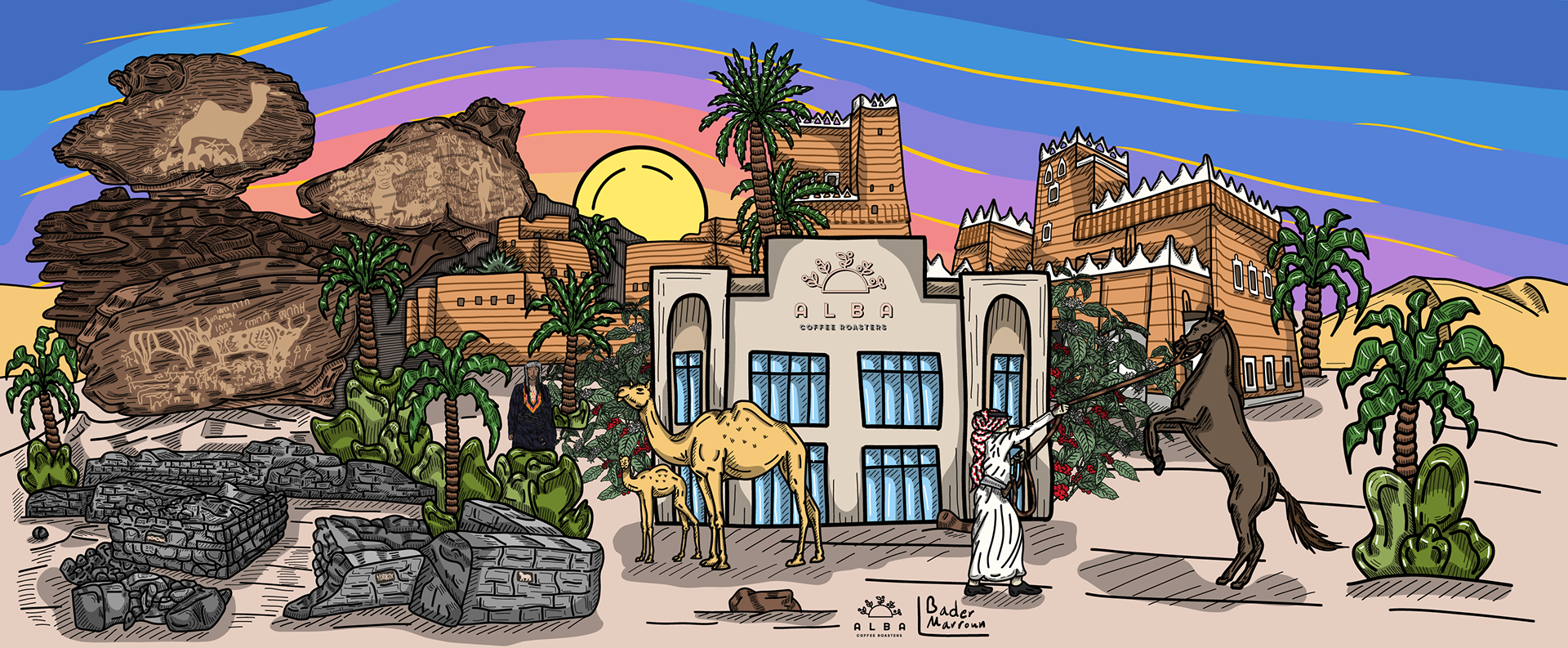 Najran Artwork: A Tale of History and Nature Through Art This artwork, developed for Alba Café and Roastery in the Najran Cup, embodies the landmarks of the Najran region within an artistic frame that reflects the fragrance of history and the depth of civilization. Its details travel from the historic site of the People of the Trench and the inscriptions that document moments of past life, to the UNESCO-listed Hima cultural area, where carvings depict life in ancient times. The artwork also highlights the region’s mud-brick architecture and palm trees, symbols of authenticity and heritage. It celebrates traditional attire, with the janbiya (dagger) featured in cultural garments and folkloric dances. The piece also shines a light on the nobility of horses and camels and their deep-rooted connection to Najrani identity. In the background, the vast Empty Quarter desert and rocky terrains stretch out, adding depth and a unique texture to this inspiring visual narrative.