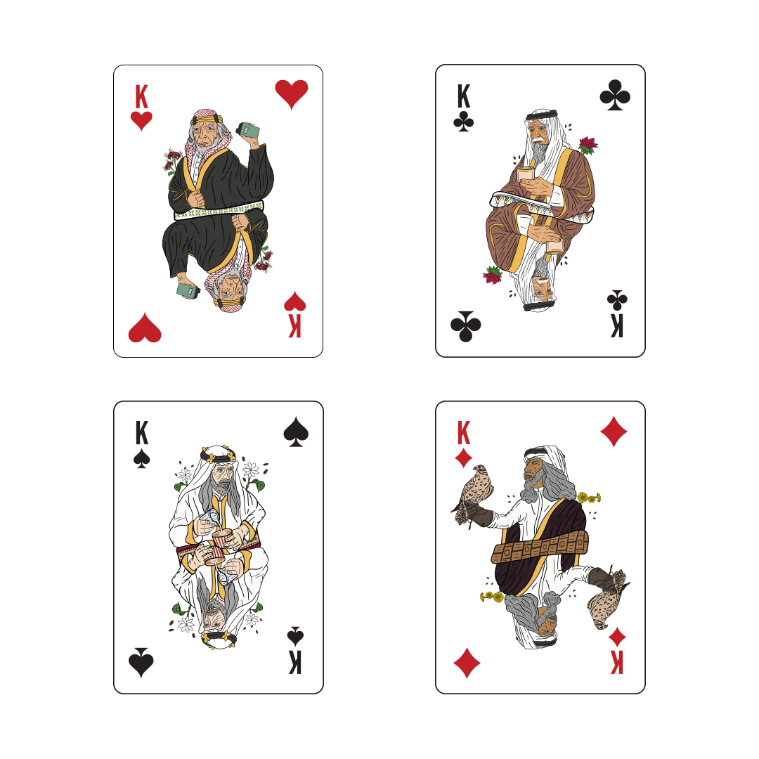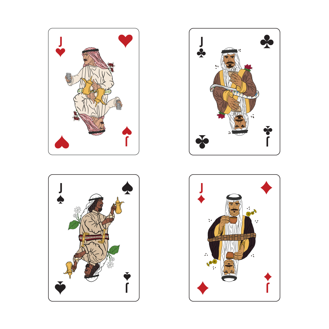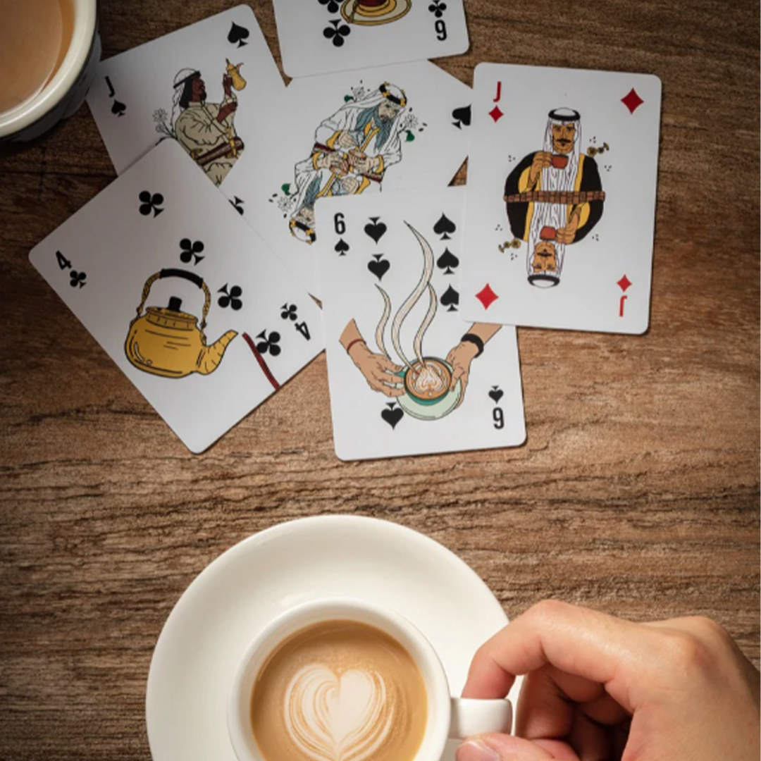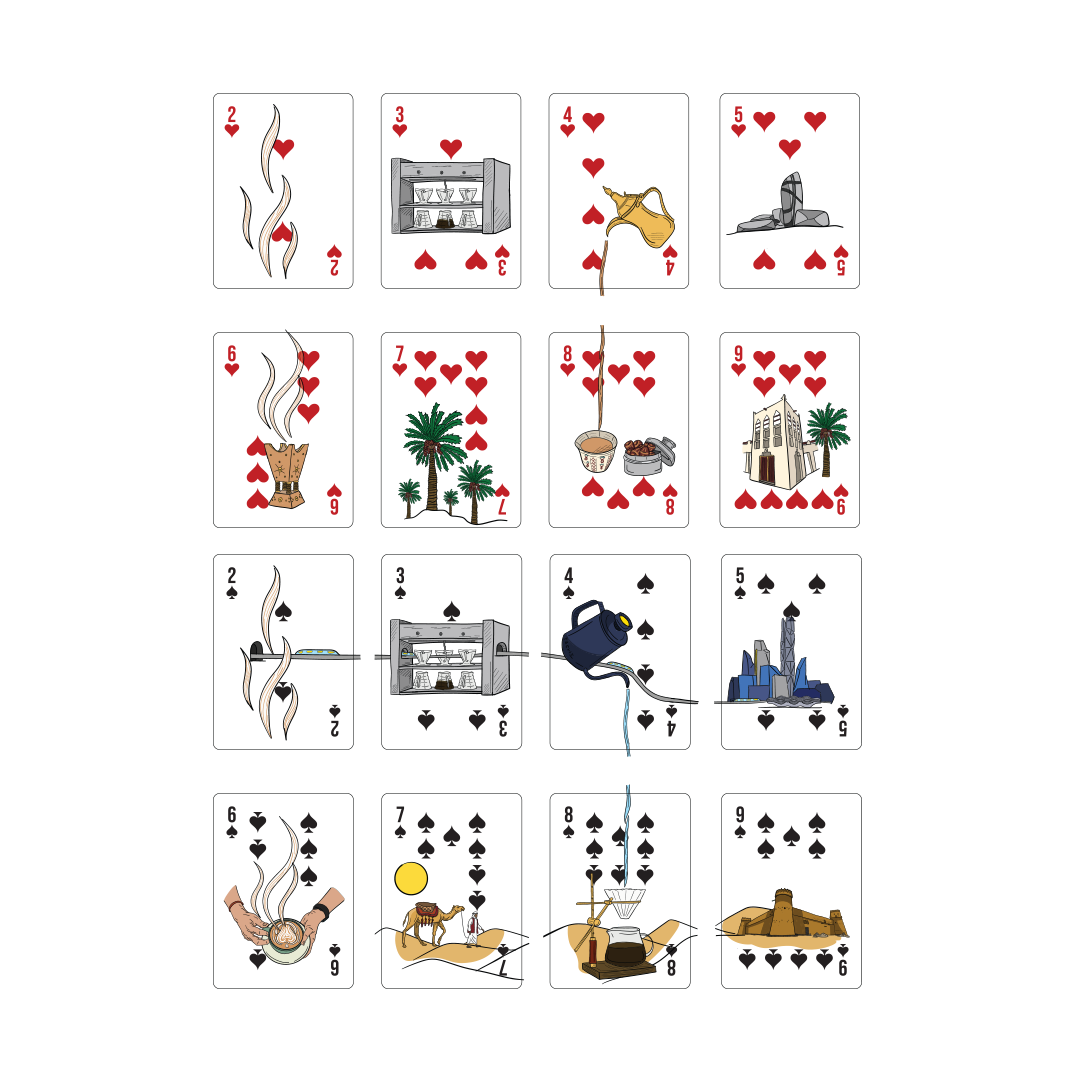 In pride of the Saudi culture and in celebration of the high level that specialty coffee has reached in our nation, we designed playing cards inspired by the depth of our local culture and connected to some of the most famous Saudi regions in collaboration with Specialty Hub. The playing cards were designed with creativity and precision, incorporating many local landmarks, along with touches of traditional attire and coffee brewing tools. These cards are not just a means of entertainment, but a complete artistic work filled with rich details