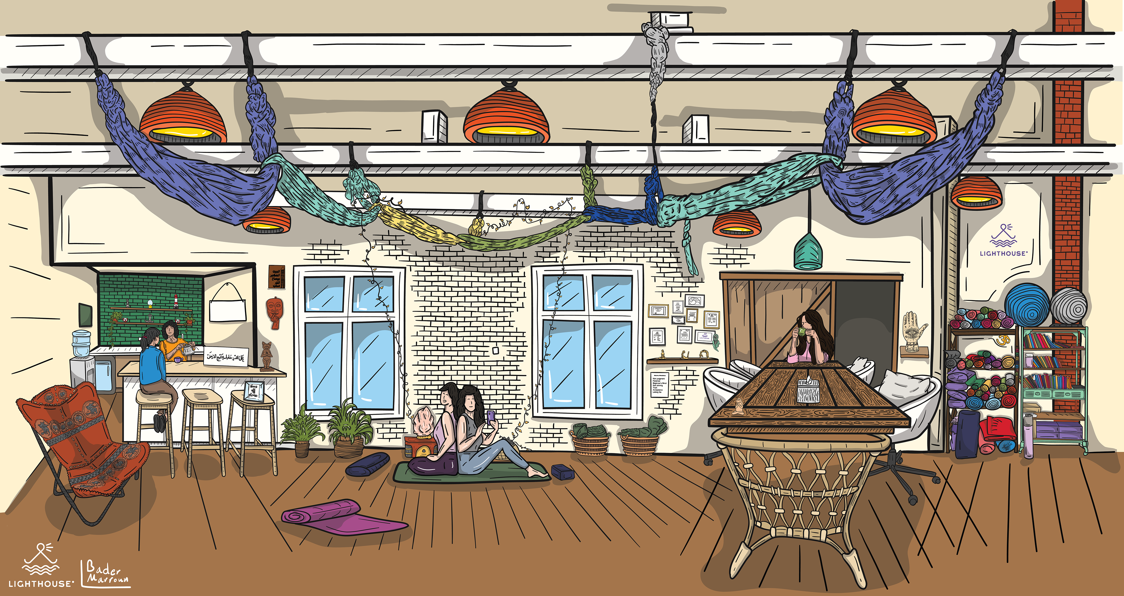جاءت لوحة روح المكان لتجسيد جوهر المساحة وأجوائها، حيث تعبر عن الأحاسيس واللحظات التي تُبنى عبر الذكريات وتجارب قضاء الوقت في زوايا المكان المتنوعة. بتعاون خاص مع استوديو لايت هاوس، قمنا بتصميم لوحة فنية ساحرة تحكي قصة المكان بين الماضي والحاضر، تجمع بين الجمال والأناقة والهدوء، لتعبر عن تجربة اليوغا التي يعيشها رواد الاستوديو.