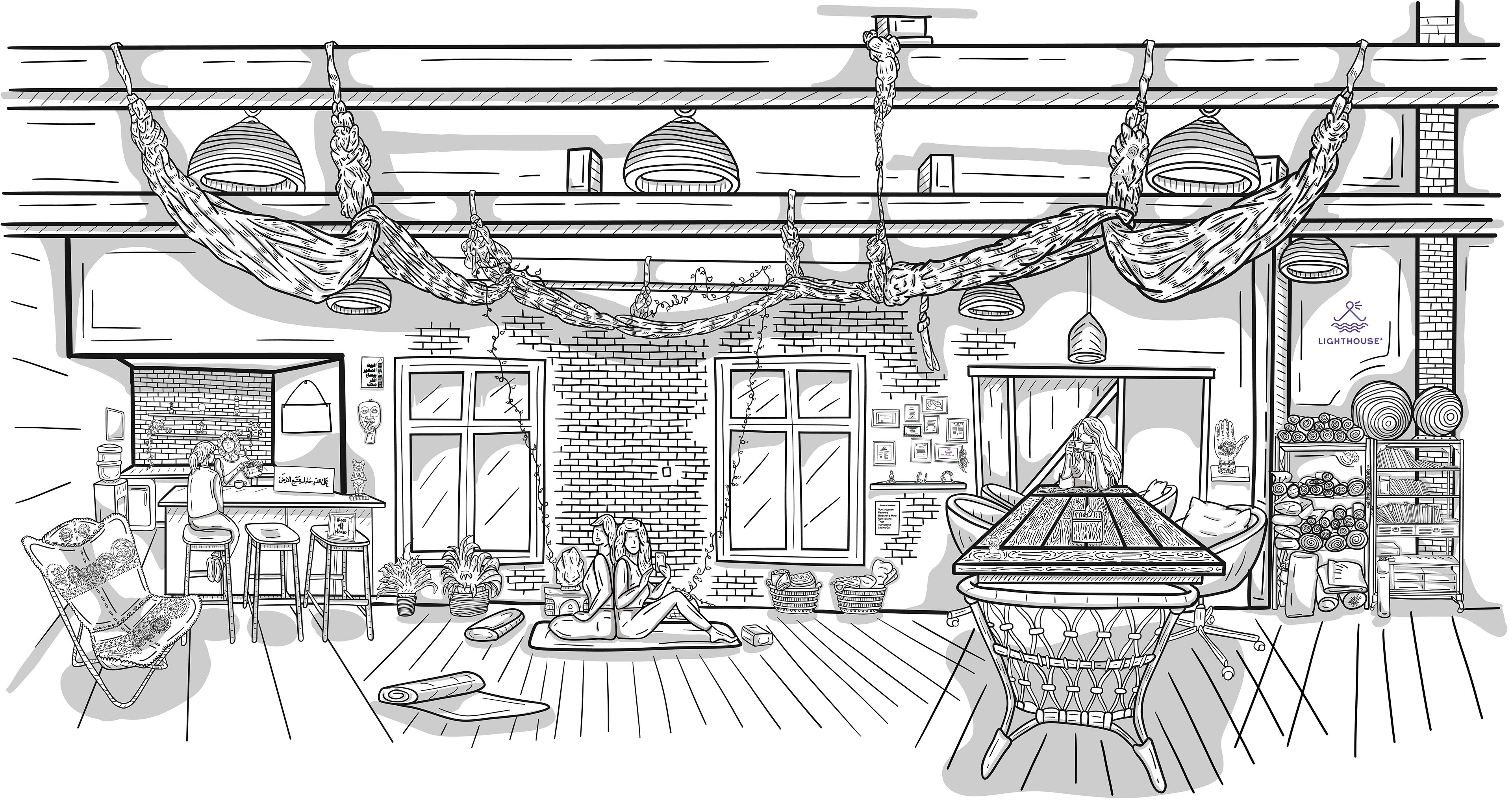 The "Spirit of a Place" artwork was created to capture the essence and atmosphere of the space, conveying the feelings and moments built through memories and shared experiences in its various corners. In a special collaboration with Lighthouse Studio, we designed a captivating artwork that tells the story of the place, bridging past and present, and blending beauty, elegance, and tranquility, embodying the yoga experience embraced by the studio’s visitors.